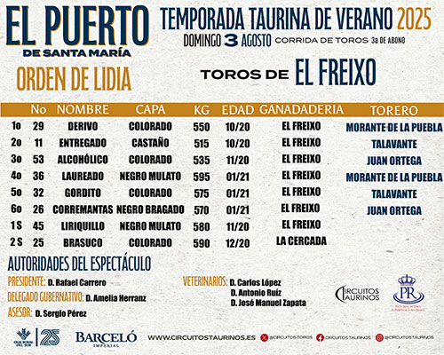 03 Agosto 2025El Puerto (Cádiz) Seis de El Freixo para el tercer festejo de la Temporada de Verano de El Puerto Los toros de El Freixo, propiedad de Julian López El Juli, que se lidiarán esta tarde en el tercer festejo de la temporada de verano de El Puerto de Santa María, ya han sido sorteados y enchiquerados en los corrales de la Plaza Real. Morante de la Puebla, Alejandro Talavante y Juan Ortega serán los encargados de su lidia. El primer sobrero pertenece a la ganadería titular, mientras el segundo luce el hierro de La Cercada. Estos son los datos de los toros y la relación completa de cuadrillas y autoridades del espectáculo:E