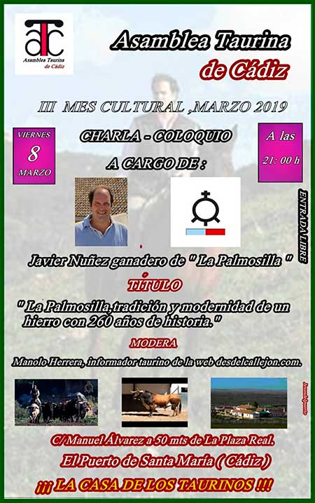 06 Marzo 2019El Puerto (Cádiz) El ganadero de La Palmosilla Javier Núñez asistiraa a a Asamblea Taurina de Cádiz en su sede de El Puerto de Santa Maria para elebrar una conferencia dentro del lII mes cultural.