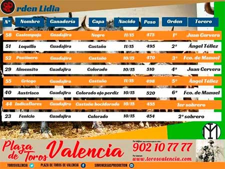 11 Marzo 2019Valencia. Sorteados y enchiquerados en Valencia ocho novillos de Guadajira para ser lidiados esta tarde, a partir de las cinco, por Juan Cervera, Ángel Téllez y Francisco de Manuel en la primera de las dos novilladas con picadores de la Feria de Fallas.