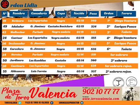 Dos de Los Espartales y cuatro de O. Jimenez para hoy en Valencia