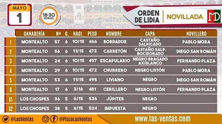 Madrid. Primer festejo de la Feria de la Comunidad de Madrid Novillos de Montealto para Pablo Mora, Diego San Román y Fernando Plaza.
