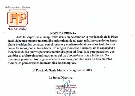 07 Agosto 2019El Puerto (Cádiz) Los aficionados de la ciudad gaditana de , El Puerto de Santa Maria cuestiónan a través de la Federación de Peñas "La Afición", el cese de los presidentes de los festejos taurinos de la Plaza Real, que durante las últimas ocho temperodas han venido desepenñando sus cargos.