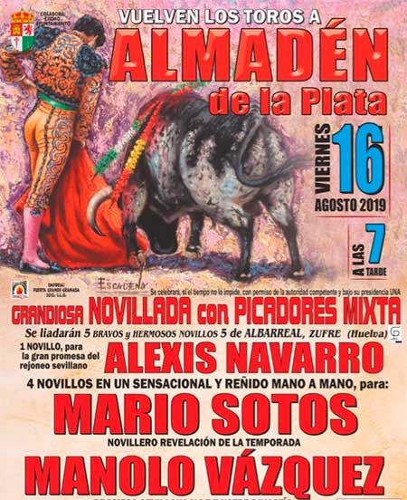 Viernes 16 de agosto. Novillada con picadores mixta. Novillos de Albarreal para el rejoneador Alexis Navarro y los novilleros Mario Sotos y Manolo Vázquez.