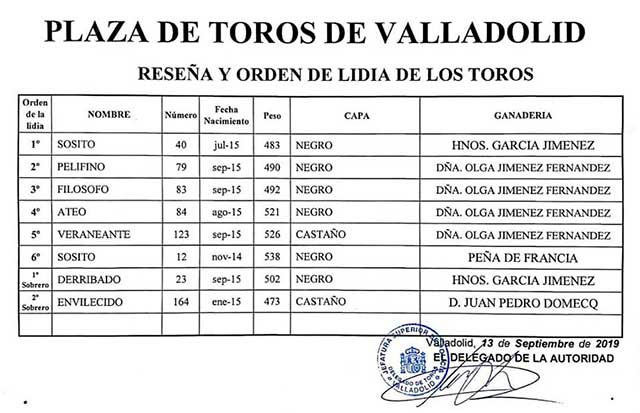 Seis toros de Olga y Hnos. Jimenez para hoy en Valladolid