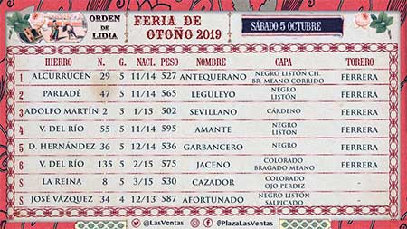 05 Octubre 2019Madrid. Antonio Ferrera se encierra con seis toros en Las Ventas tras su gran triunfo en San Isidro. Toros de Alcurrucén, Parladé, Adolfo Martín, Victoriano del Río (4º y 6º) y Domingo Hernández.