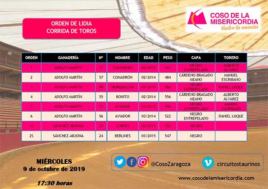 Zaragoza. Toros de la ganadería de Adolfo Martín que esta tarde serán lidiados en la plaza de toros de Zaragoza en la segunda corrida de la Feria del Pilar, por una terna compuesta por Alberto Álvarez, Manuel Escribano y Daniel Luque.