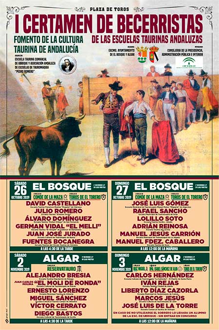 21 Octubre 2019Sevilla. Consta de 4 becerradas en clases prácticas que se celebrarán 2 en la Plaza de Toros gaditanas de El Bosque y otras 2 en la Plaza de Toros de Algar,