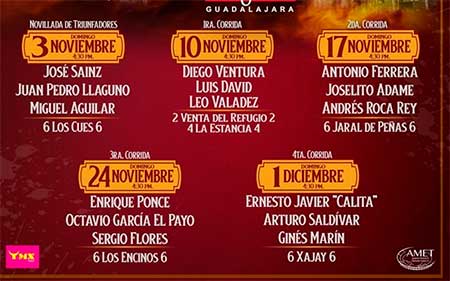 3 de noviembre: Novillos de Los Cués para los novilleros triunfadores José Sainz, Juan Pedro Llaguno y Miguel Aguilar quien tuvo destacada actuación el 6 de octubre, estará en disputa el trofeo Manuel Capetillo. (Cabe aclarar que el novillero Diego Sanromán quien cortó dos oreias y un rabo se encuentra lesionado de las cervicales, motivo por el cual no pudo ser programado.