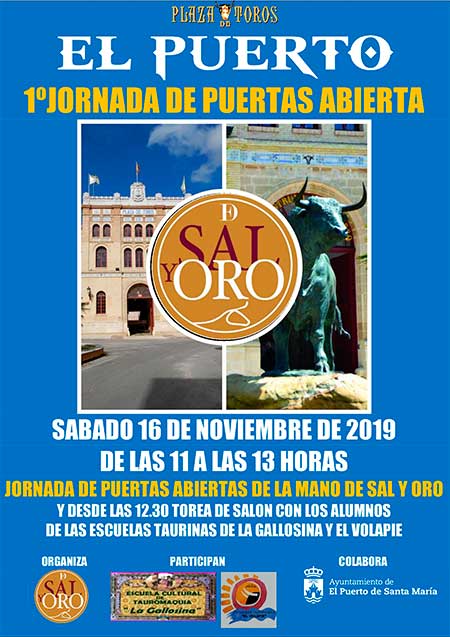 12 Noviembre 2019El Puerto (Cádiz) Jornada de Puertas Abiertas “De Sal y Oro” el sábado con toreo de salón. Tentadero solidario el domingo de la Escuela Taurina “La Gallosina” para “Sol y Vida”