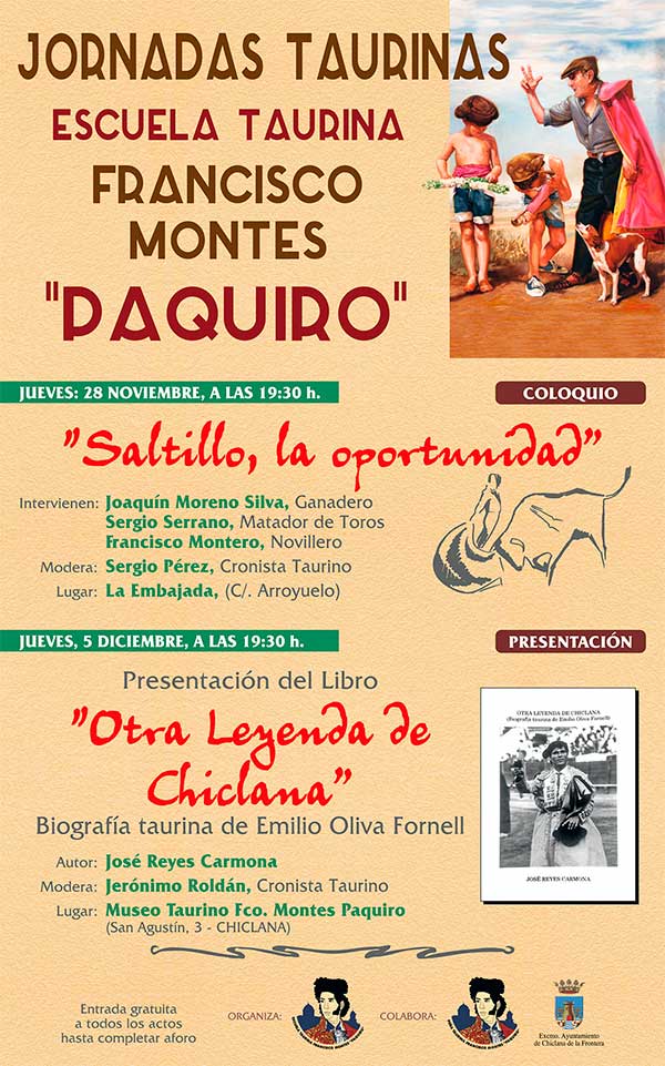 Chiclana (Cádiz) La Peña y Escuela Taurina Francisco Montes "Paquiro" organiza los dias 28 de noviembre y 5 de diciembre sendas charlas taurinas.