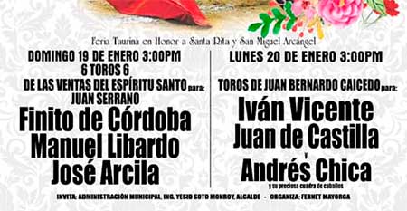 Lunes 20 de enero: Corrida mixta. Reses de Juan Bernardo Caicedo para el rejoneador Andrés Chica y los diestros Iván Vicente y Juan de Castilla.