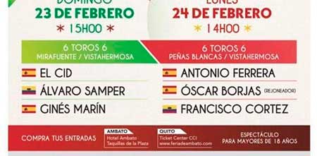 El ciclo contará con la participación de importantes toreros españoles y ecuatorianos. Entre ellos El Cid, quien ocupa el noveno puesto en el escalafón mundial y cuya última faena vestido de traje de luces tendrá lugar en la plaza de toros de Ambato.