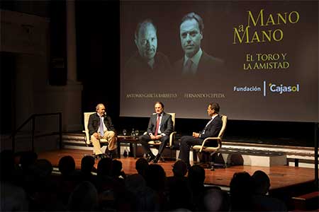 El matador de toros Fernando Cepeda y el escritor y periodista Antonio García Barbeito protagonizaron anoche una nueva edición de los Mano a Mano de la Fundación Cajasol, en concreto la número 58 de estos encuentros culturales que se celebran en Sevilla desde 2007.