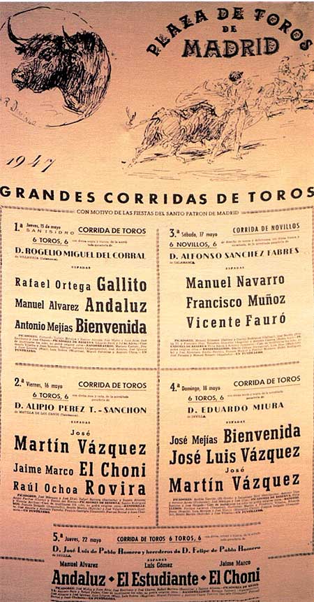 Pronto, al año de su toma de posesión, esto es en 1947, siguiendo los ejemplos de Sevilla, Pamplona, Valencia y Bilbao, decide crear la primera Feria Taurina de Madrid, con casi todo el toreo en contra, compuesto por un abono, que llevaba desaparecido desde la guerra, de cinco corridas de toros y una novillada. El primero tuvo lugar el 15 de mayo, festividad del patrono San Isidro Labrador, con Rafael Ortega "Gallito", Manuel Álvarez “Andaluz” y Antonio Bienvenida con ganado de Rogelio Miguel del Corral. La primera lidia y muerte fue a cargo de Gallito que escuchó los tres avisos, mientras Antonio Bienvenida terminó en la enfermería por cogida. El restos de festejos fueron el 16, 17, 18 y 22 con el sevillano Pepín Martín Vázquez como triunfador de la Feria con dos vueltas al ruedo. Los precios de las entradas oscilaron entre las 125 pesetas de una barrera de sombra y las 10 pesetas de una andanada de sol. En su conjunto, una feria de “no hay billetes” en lo económico, con total ausencia de triunfos y de la figura de Manolete por desavenencias en su contratación con la empresa, quien fallecería meses despues.