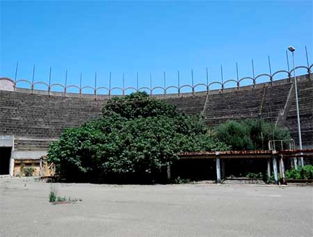 Cuarenta y cinco años después de la independencia, en el lugar donde corrieron los toros aún siguen en pie los graderíos en estado ruinoso, salpicados de pintadas. La basura se acumula, las ratas abundan y un olor nauseabundo obliga a contener el aliento.