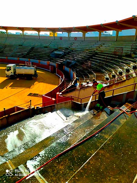 Por otro lado, el empresario Carmelo García conjuntamente con el Ayuntamiento de Morón de la Frontera ha coordinado las tareas de limpieza y desinfección de los tendidos de la plaza toros.