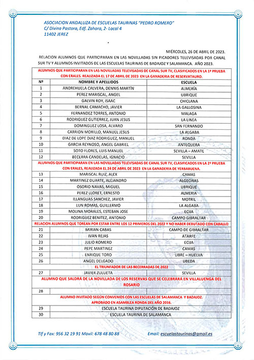 28 Abril 2023Jerez (Cádiz) El pasado dia 26 la Junta Directiva de la Asociacióin andaluza de escuelas taurinas Pedro Romero dio a conocer los alumnos que participarán en las novilladas sin picadores televisadas por Canal Sur.