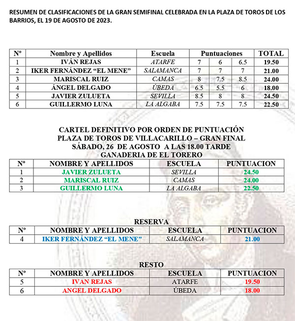 22 Agosto 2023La Gran Final que se celebrará en Villacarrillo el 26 de agosto de 2023., con la participación de Javier Zulueta, Mariscal Ruiz y Guillermo Luna.