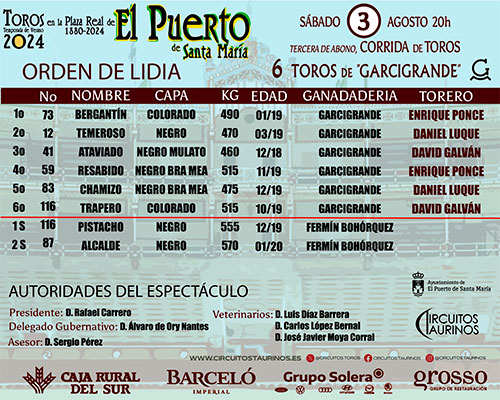 Los encargados de su lidia serán los matadores Enrique Ponce, que se despide de la afición portuense en este festejo, Daniel Luque y David Galván.
