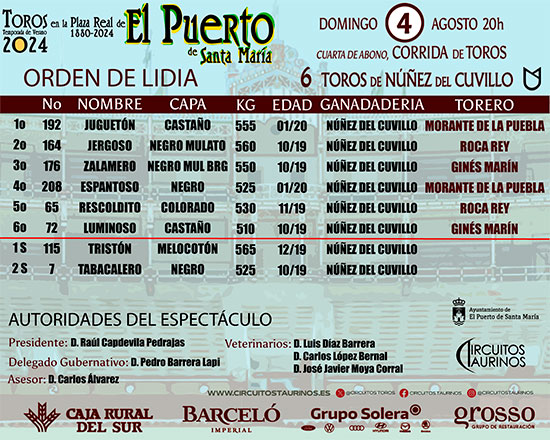 04 Agosto 2024El Puerto (Cádiz) Sorteados los toros de Núñez del Cuvillo para el cuarto festejo de la Temporada de Verano de El Puerto de Santa María