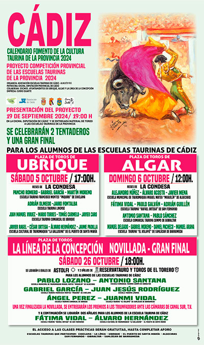 La XII Competición Provincial de las Escuelas Taurinas de Cádiz, -esta enmarcada dentro del Calendario de Fomento de la Cultura Taurina de la Provincia 2024- e incluye tres festejos en clase práctica. Dos tentaderos que se celebrarán el sábado 5 de octubre en Ubrique y el domingo 6 en Algar, y el sábado 26 en La Línea de la Concepción, donde será la Gran Final que será retransmitida por Canal Sur TV.