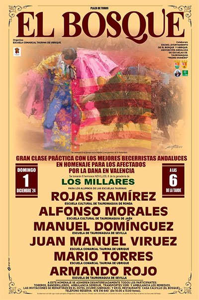 Al mediodía de hoy, miércoles 20 de noviembre, se ha presentado en el Excmo. Ayuntamiento de El Bosque, el cartel de la Becerrada Extraordinaria en Homenaje a los afectados por la DANA en Valencia, donde se lidiarán reses de Los Millares, para los Mejores Becerristas Andaluces que han sido invitados por la escuela de Ubrique.