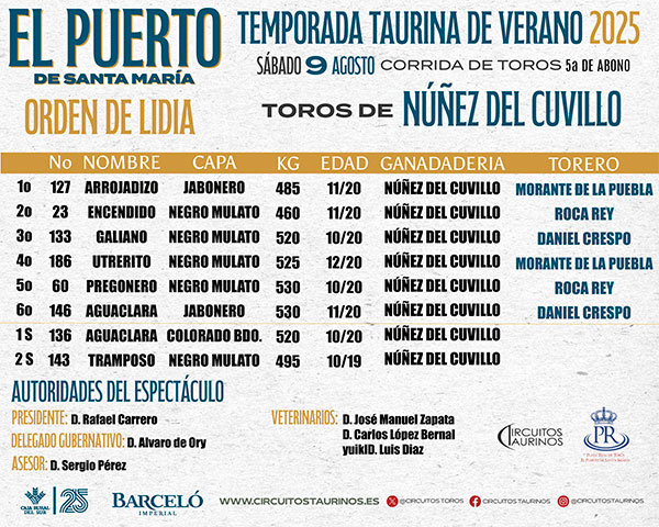 09 Agosto 2025Los seis toros de Núñez del Cuvillo que se lidiarán esta tarde en el quinto festejo de la Temporada de Verano de El Puerto de Santa María, así como los dos sobreros de la divisa titular, han sido sorteados y enchiquerados en los corrales de la Plaza Real. José Antonio Morante de la Puebla, Andrés Roca Rey y Daniel Crespo serán los encargados de su lidia en lo que es sin duda el gran acontecimiento taurino del verano, para el que se agotaron las localidades hace más de una semana. Estos son los datos de los toros y la relación completa cuadrillas y autoridades que regirán el espectáculo:
