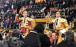 Trabajada salida a hombros de Enrique Ponce y oreja sufrida Paco UreñaValencia. Tres toros de Domingo Hernández y tres de Garcigrande (3º, 4º y 5º), escasamente armados y de muy desigual presentación, con varios de muy justo trapío junto a otros de mayor volumen y cuajo. En conjunto, corrida desclasada y sin raza que se defendió o se rajó sin emplearse nunca. Los astados lucieron divisa negra por el reciente fallecimiento de su ganadero. |