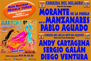 Presentados los carteles de la Feria de Illescas26 Diciembre 2019Illescas (Toledo) Morante, Manzanares y Aguado, en la corrida de la Feria del Milagro de Illescas