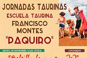 Jornadas taurinas en la tierra ·Paquiro"27 Noviembre 2019Chiclana (Cádiz) La Peña y Escuela Taurina Francisco Montes "Paquiro" organiza los dias 28 de noviembre y 5 de diciembre sendas charlas taurinas.