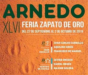 Arnedo cierra el Zapato de Oro30 Agosto 2019Arnedo. La Comisión Taurina del Zapato de Oro de la localidad riojana de Arnedo ha hecho públicos en el día de hoy los carteles de su XLVI Feria de Novilladas, que se celebrará entre el 27 de septiembre y el 2 de octubre y que está compuesta por cinco fe