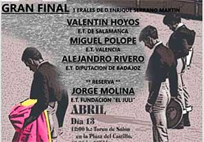 Definidos los finalistas del X Bolsín Taurino “Villa de Candeleda”26 Marzo 2019Candeleda (Ávila) . El pasado domingo se celebró la semifinal del X Bolsín Taurino “Villa de Candeleda”, tras lo cual ya se han hecho públicos los novilleros elegidos para disputar la Gran Final del Certamen, que tendrá lugar el sábado 13 de abril a partir de las 16:30 horas. |