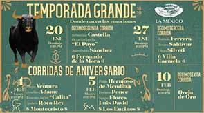La segunda parte de la Temporada Grande de La México ya tiene carteles13 Enero 2019México DF. TauroPlaza México, empresa que rige los destinos del Coso de Insugentes, ha hecho públicos los carteles que configuran la segunda parte de la Temporada Grande, que constan de cinco corridas de toros (dos de ellas mixtas), incluyéndose también las denominadas “Corridas de Aniversario”, en torno a la fecha del 5 de febrero. |